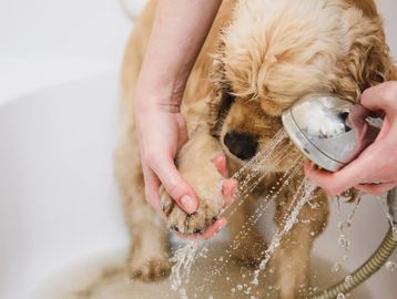 Bath and brush, ear cleaning, nails, sani trim, pawpads.